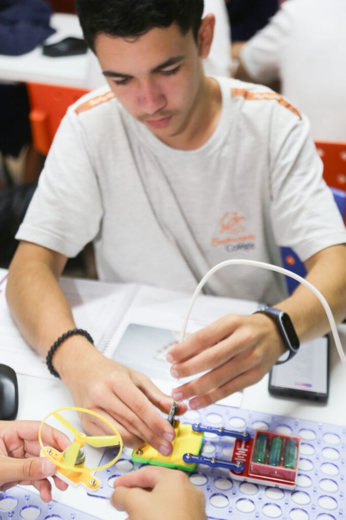 Temos também espaços como a Matemotéca, o Laboratório de Ciências, a Sala STEAM com impressora 3D e ferramentas maker, além de espaços de convivência, leitura e quadras esportivas.